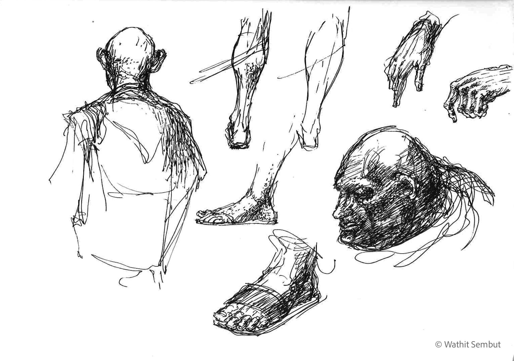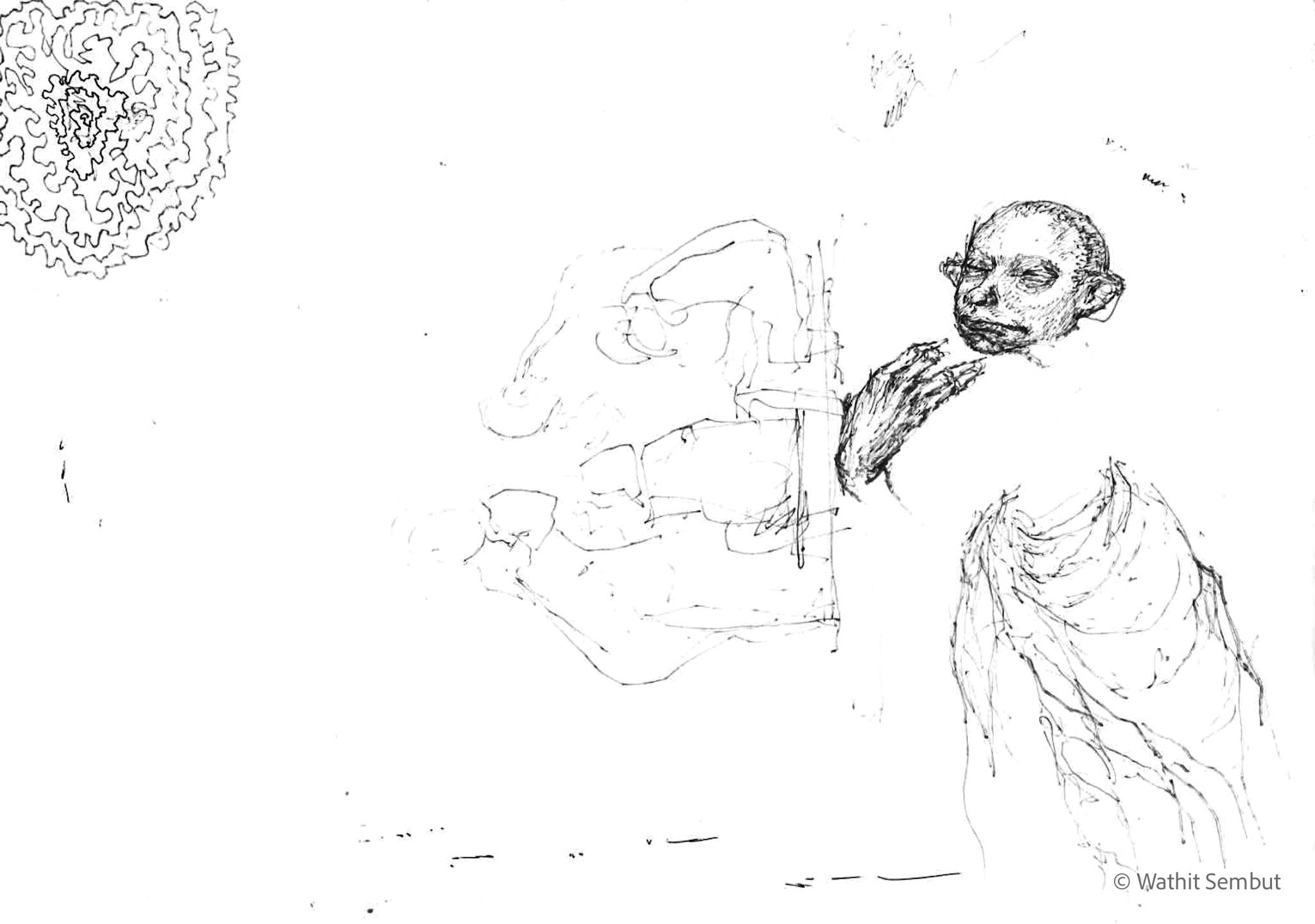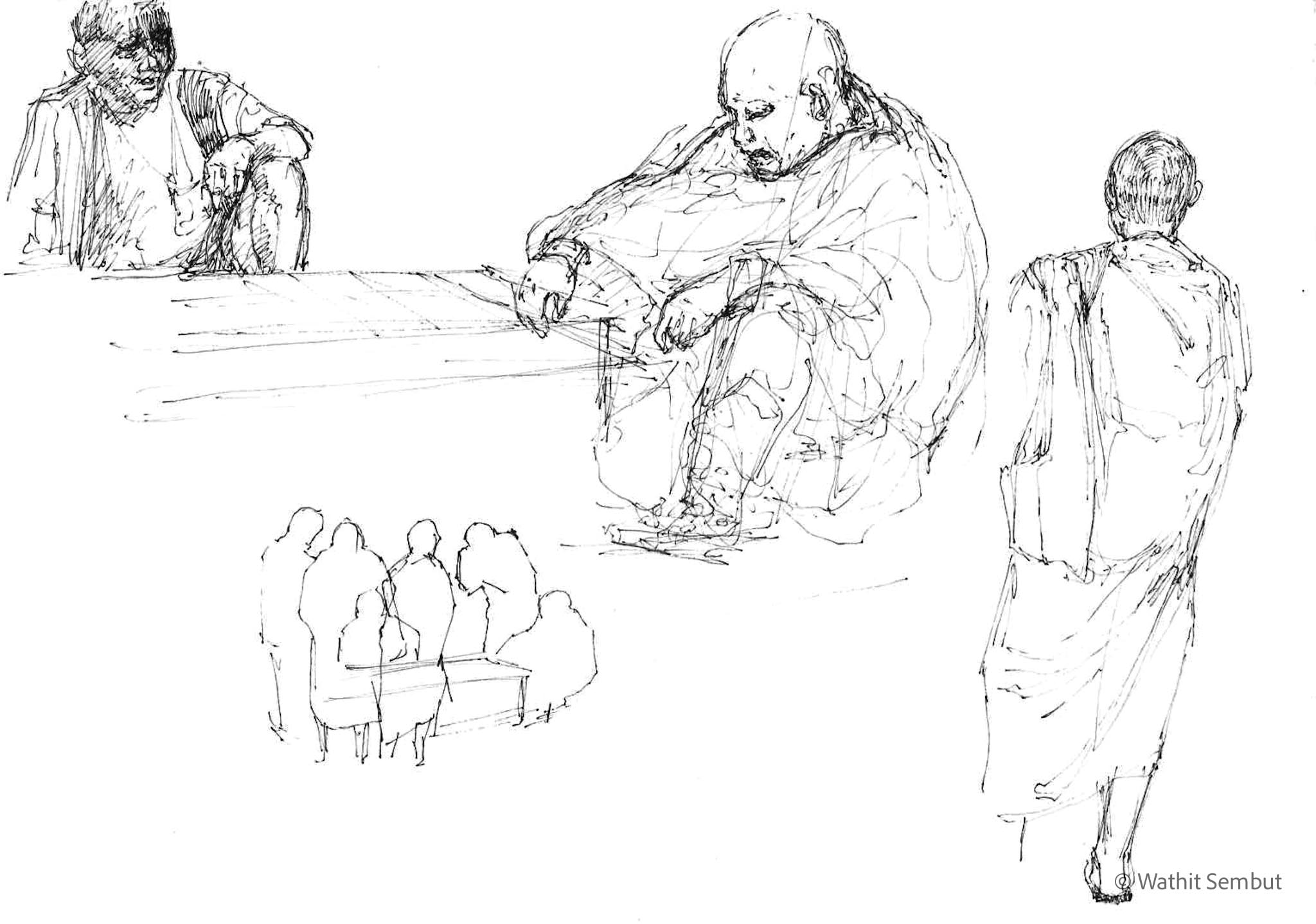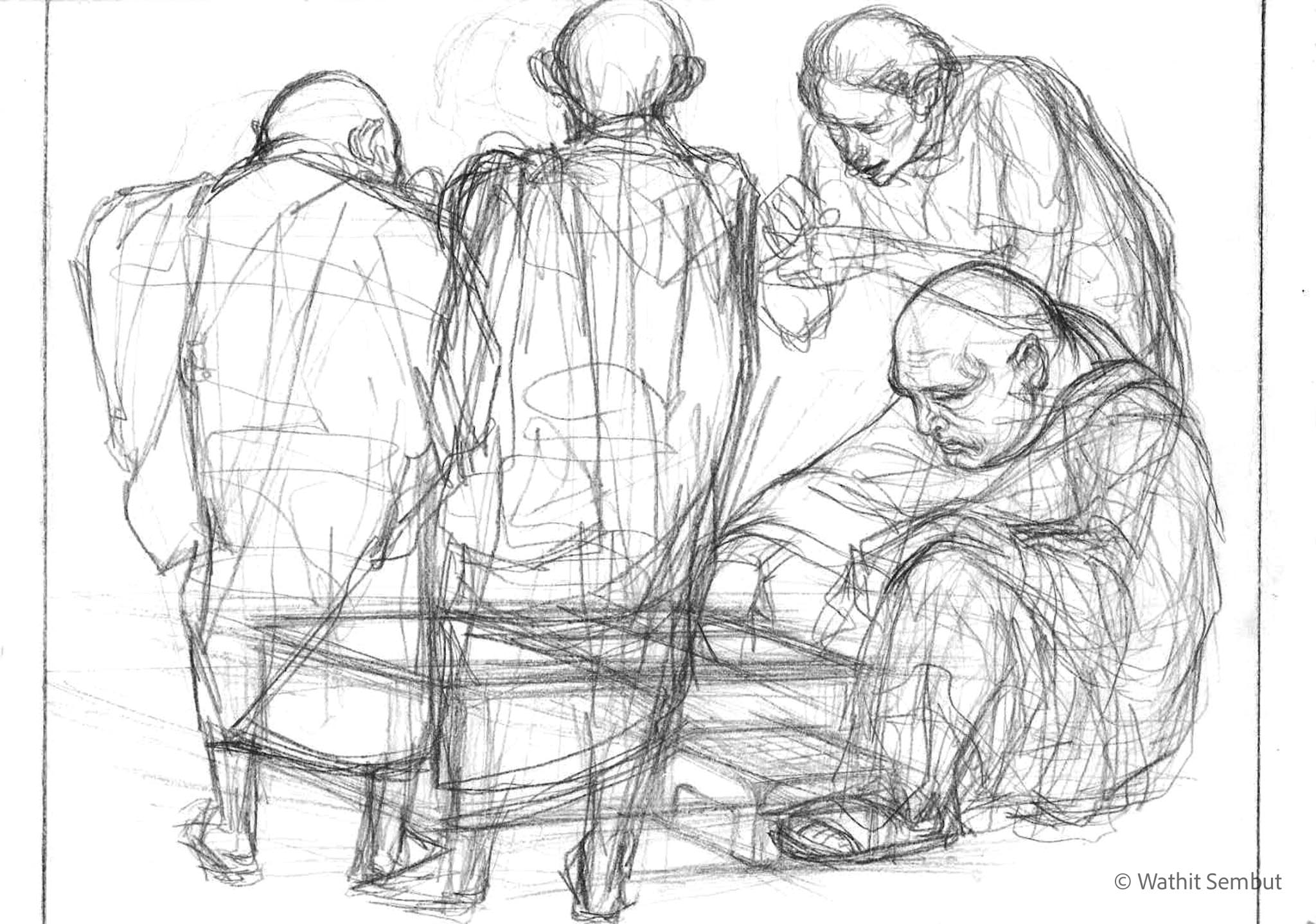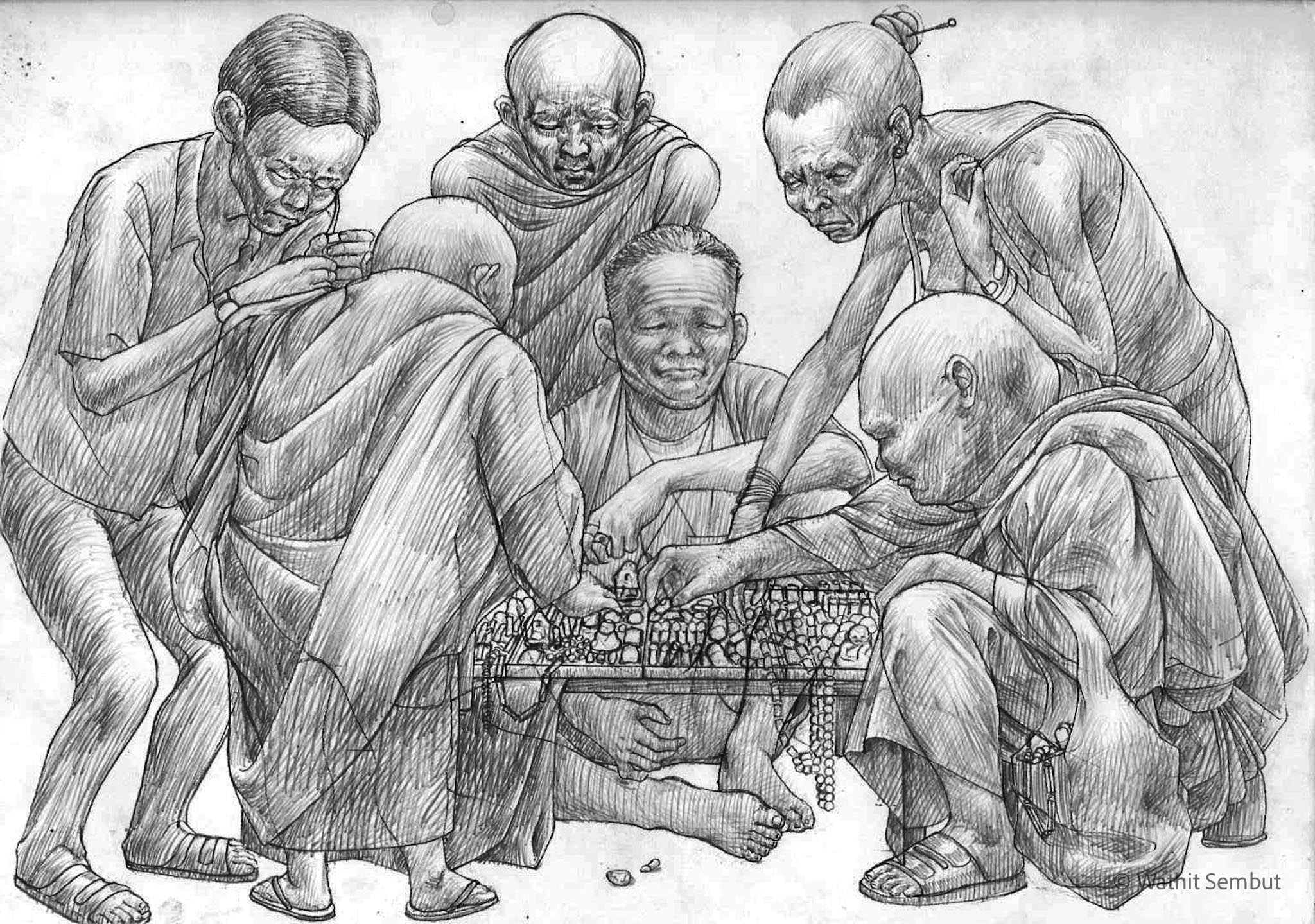 As a fine art student, I spent most of my working process with sketch and research. I usually walked around the university and made quick sketches of life in the Tha Phra Chan area in Bangkok, the old town where spiritual beliefs seamlessly blend with commerce. Despite the buddhist teachings that emphasize understanding the essence of Buddhism from within, the area was filled with vendors selling amulets, Buddha medals, horoscopes, and other lucky items, set against the backdrop of historic temples and religious heritage buildings.