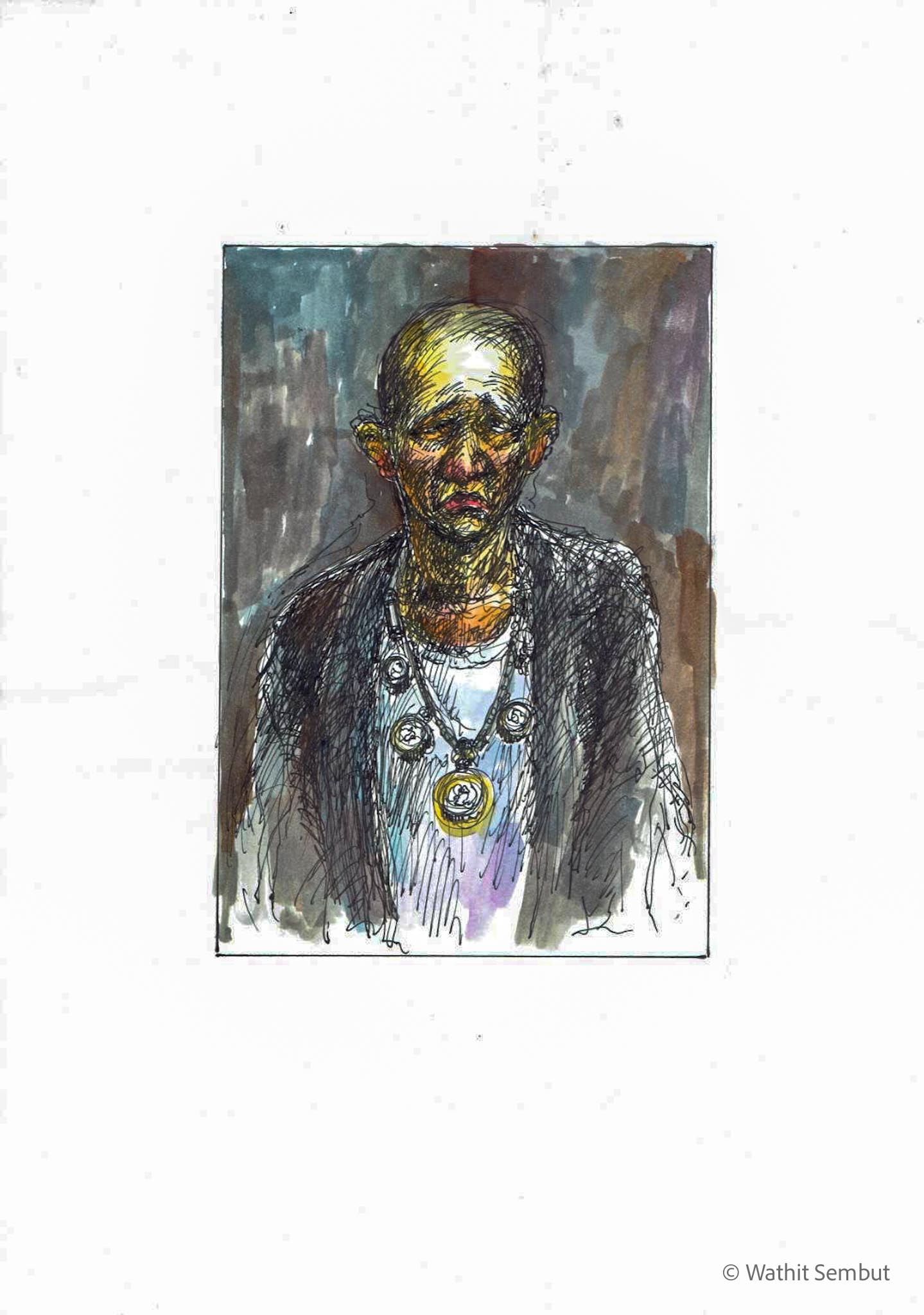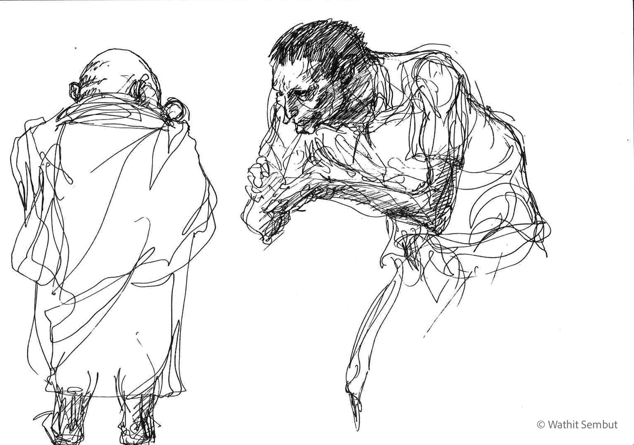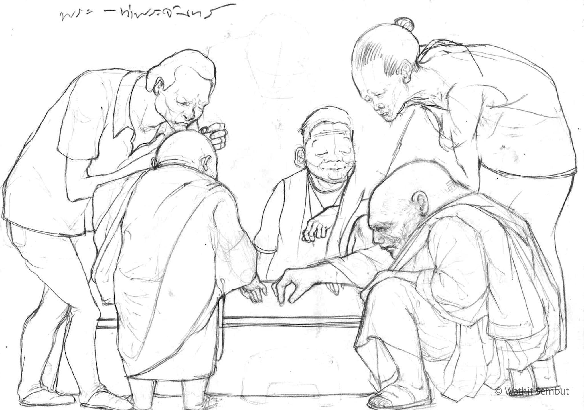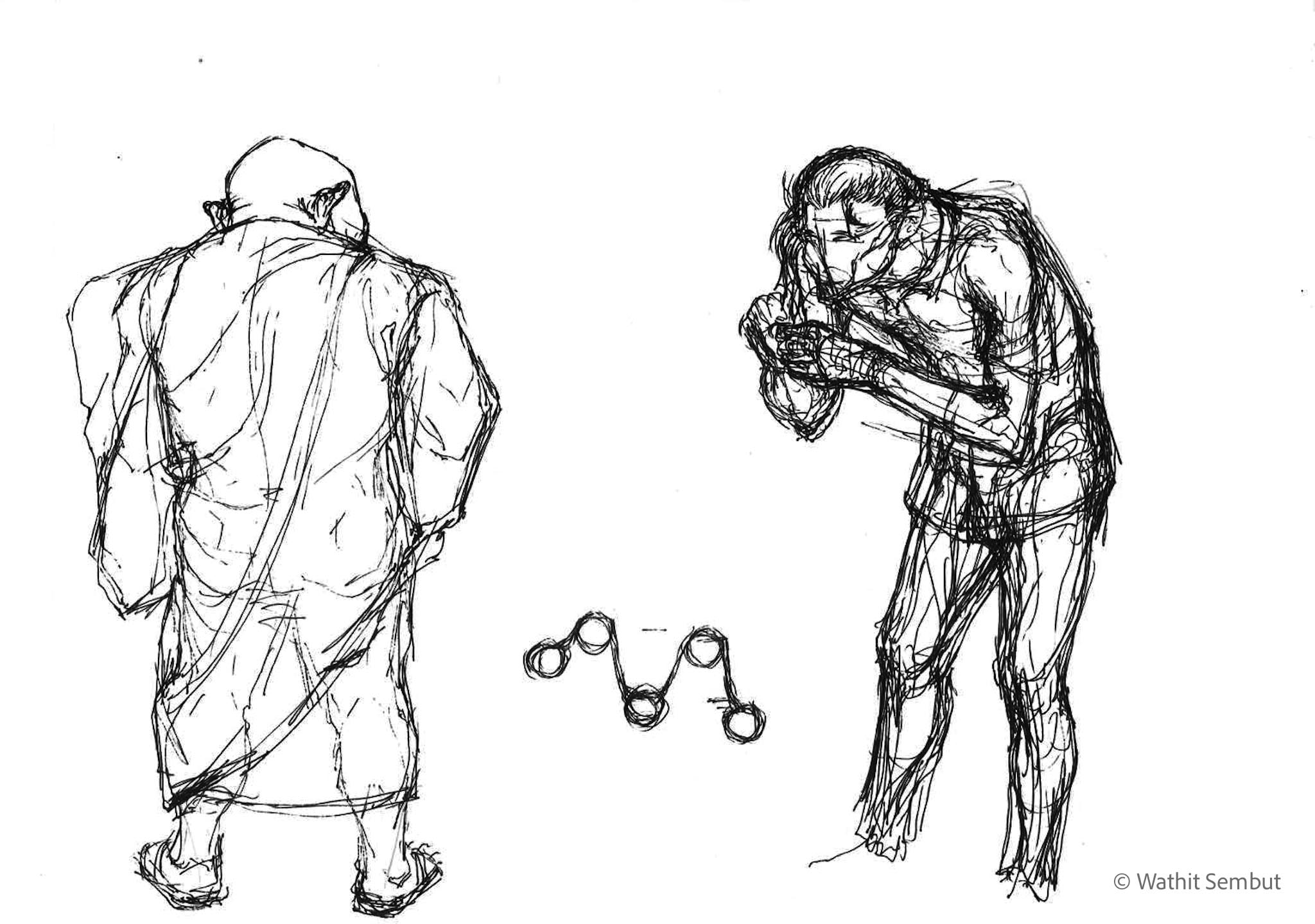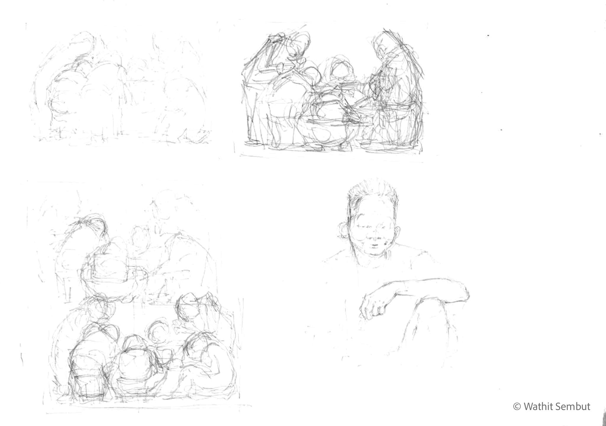 As a fine art student, I spent most of my working process with sketch and research. I usually walked around the university and made quick sketches of life in the Tha Phra Chan area in Bangkok, the old town where spiritual beliefs seamlessly blend with commerce. Despite the buddhist teachings that emphasize understanding the essence of Buddhism from within, the area was filled with vendors selling amulets, Buddha medals, horoscopes, and other lucky items, set against the backdrop of historic temples and religious heritage buildings.