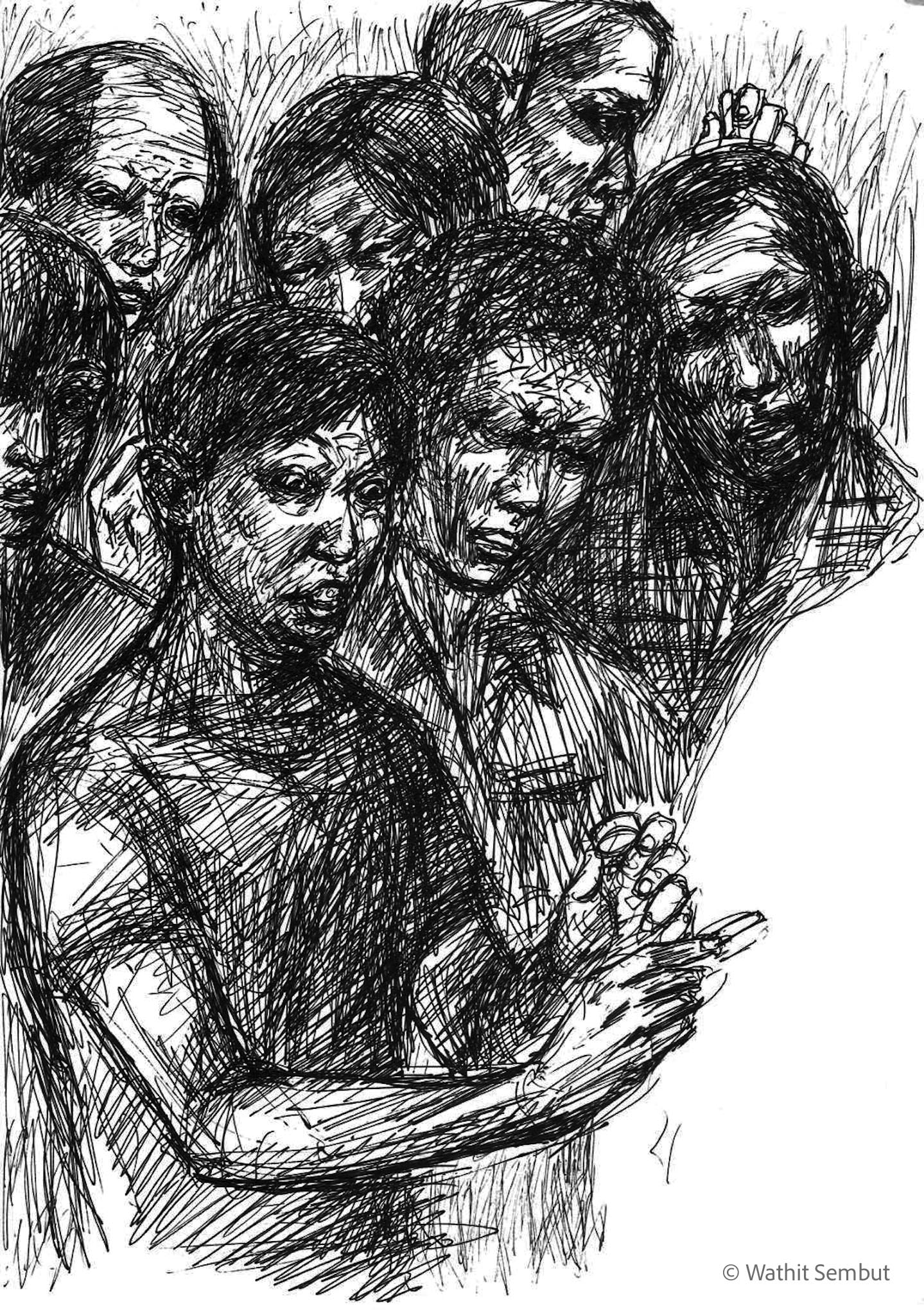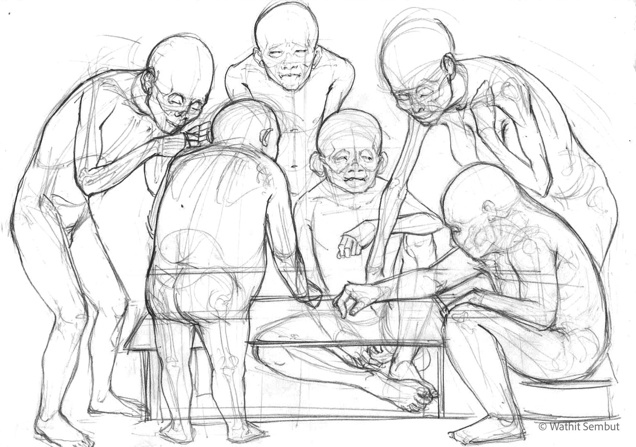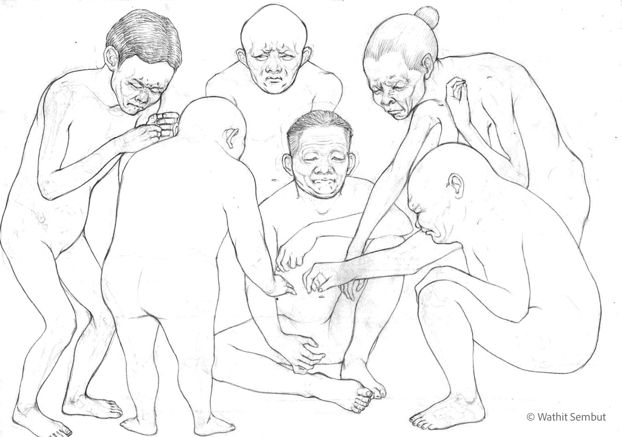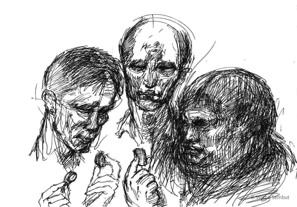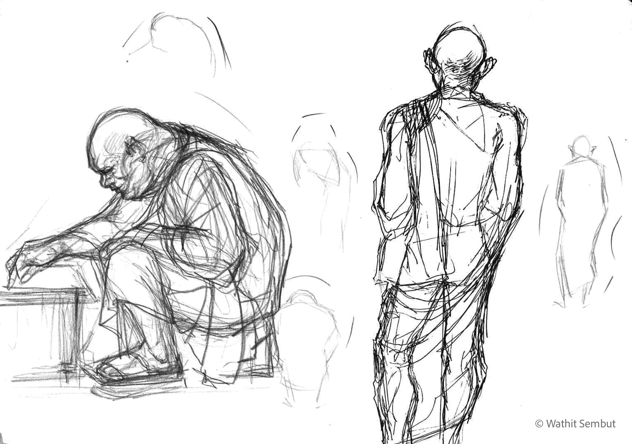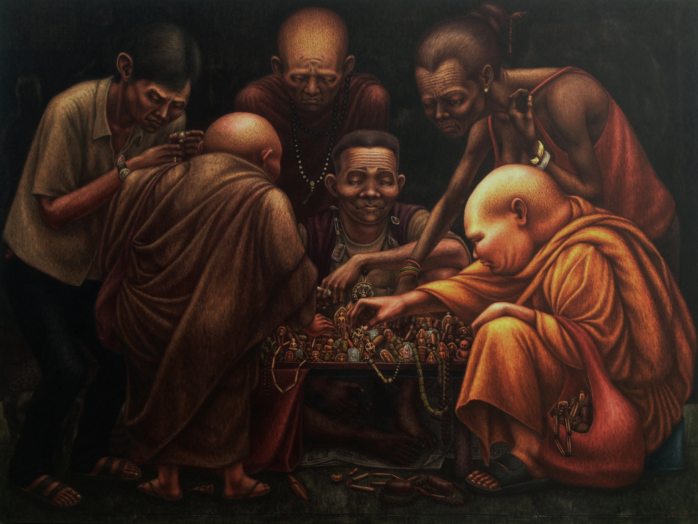 As a fine art student, I spent most of my working process with sketch and research. I usually walked around the university and made quick sketches of life in the Tha Phra Chan area in Bangkok, the old town where spiritual beliefs seamlessly blend with commerce. Despite the buddhist teachings that emphasize understanding the essence of Buddhism from within, the area was filled with vendors selling amulets, Buddha medals, horoscopes, and other lucky items, set against the backdrop of historic temples and religious heritage buildings.