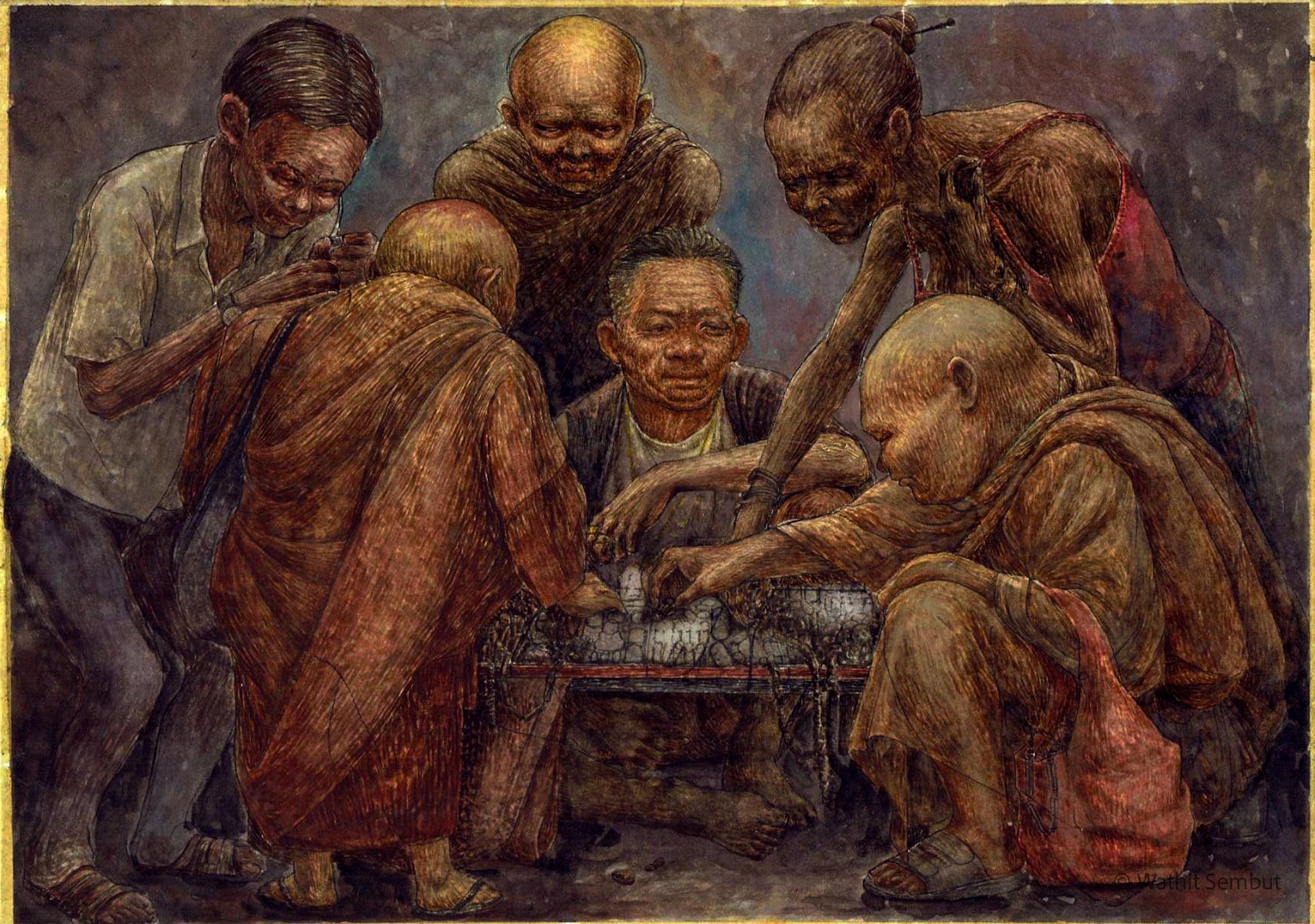 The sketch and research process may take a long time, as exemplified by “Doo Phra”, a painting I created when I was 20. This particular piece, focusing on the topic of life in the Tha Phra Chan area, required almost a year of sketching and research before I even touched the canvas. This preparation wasn’t just about collecting visual references — it was about ensuring found its right place in the final composition.