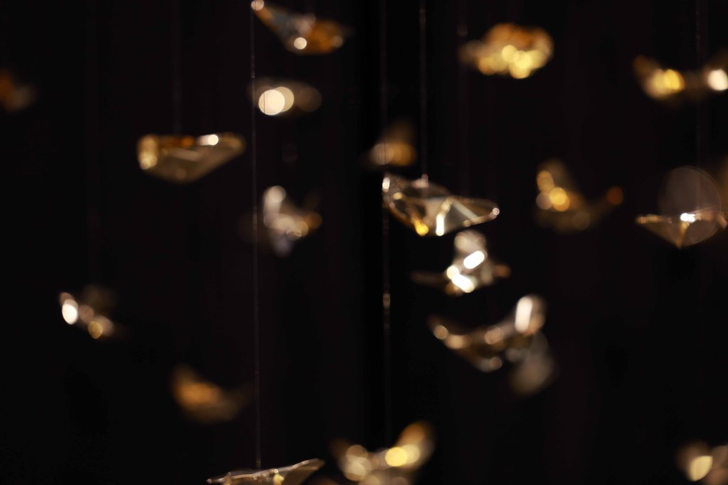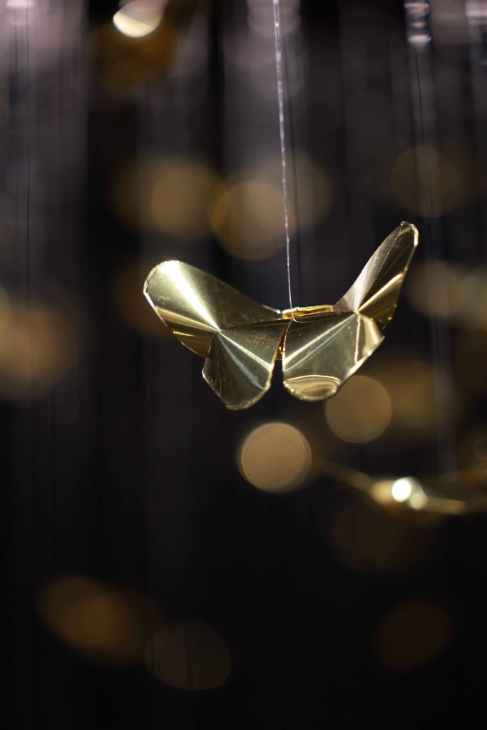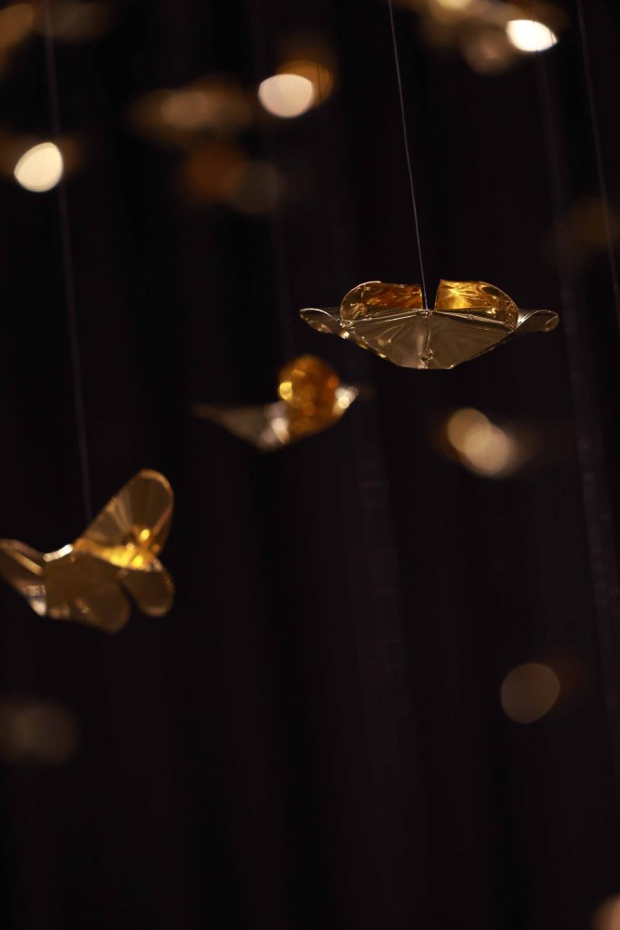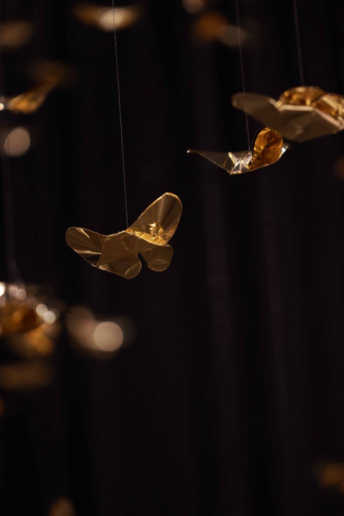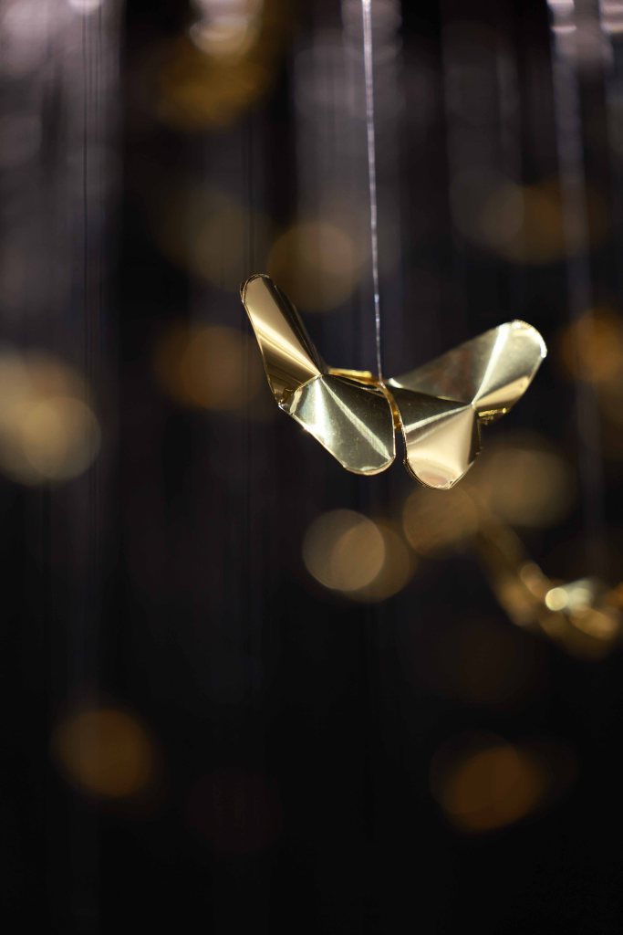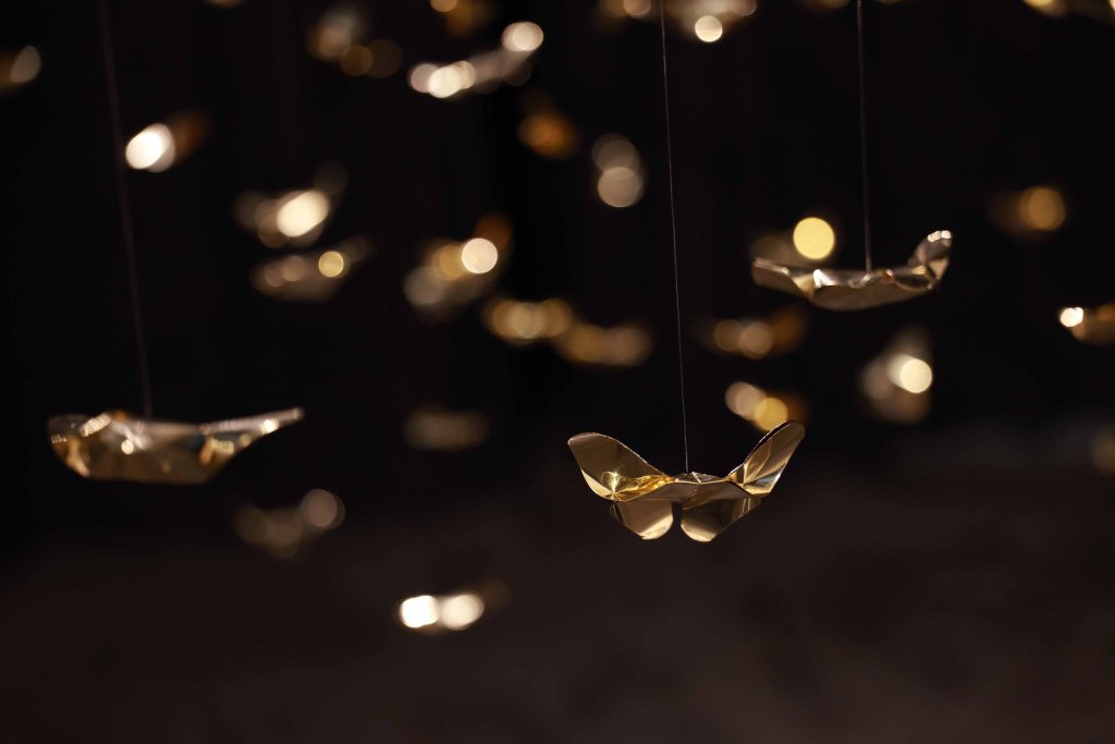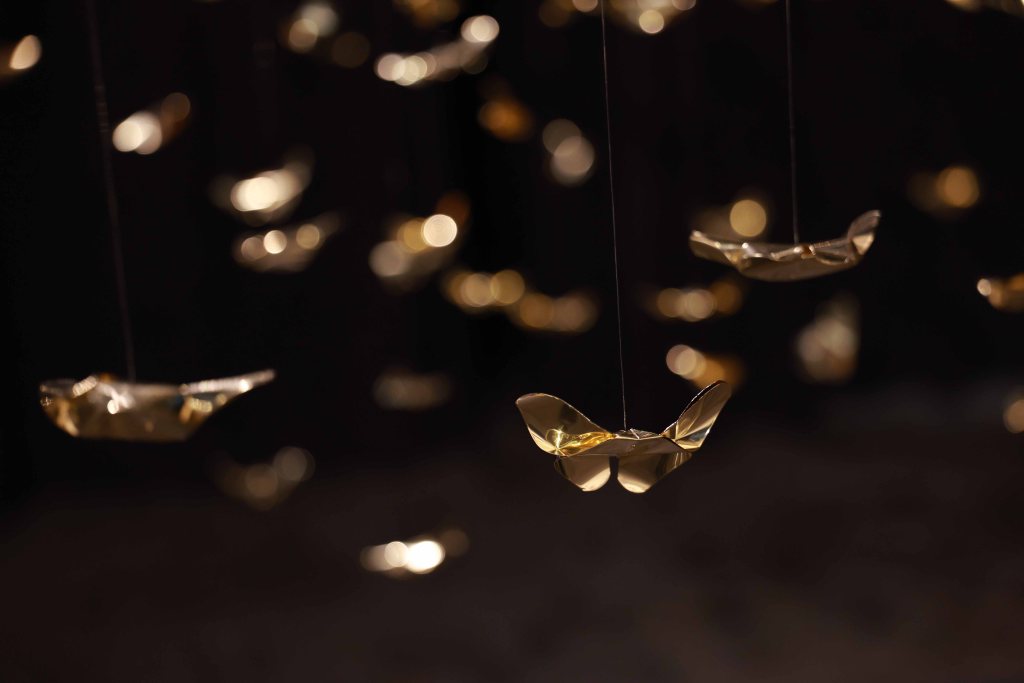 “Golden Metamorphosis” is a suspended installation sculpture that explores the process of healing and the reintegration of fragmented souls back into a state of “Oneness.” This artwork questions the concepts of fragmentation and rebirth as fundamental conditions of human existence, utilizing an artistic language that merges hand-folded brass sheets with the philosophy and profound wisdom of the Lanna culture.