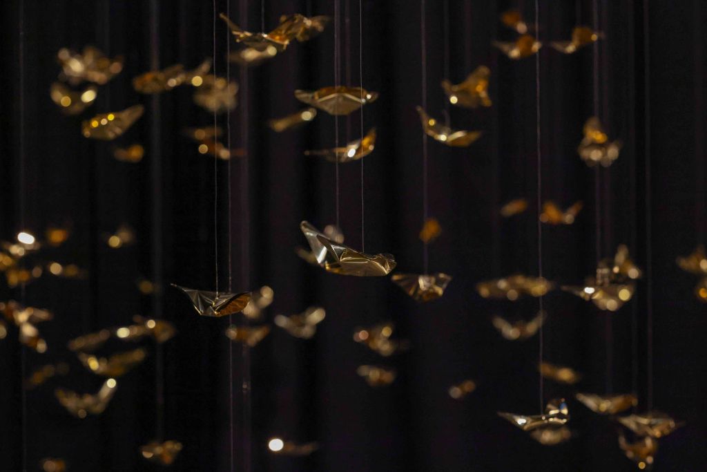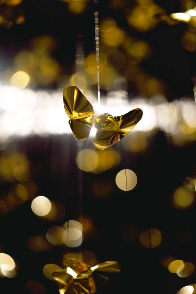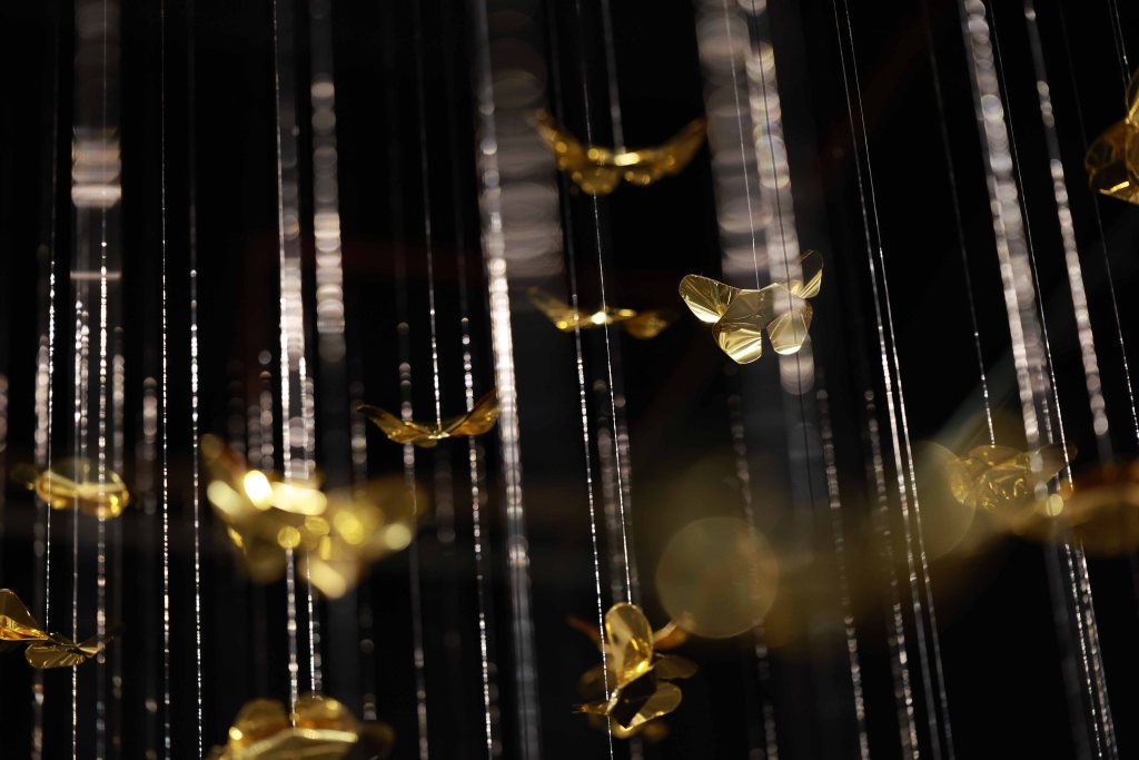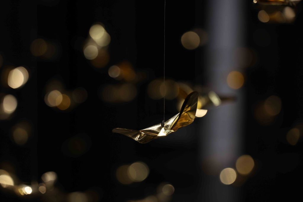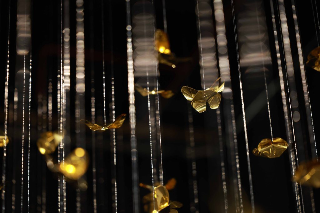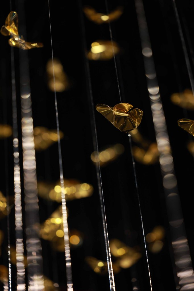 “Golden Metamorphosis” is a suspended installation sculpture that explores the process of healing and the reintegration of fragmented souls back into a state of “Oneness.” This artwork questions the concepts of fragmentation and rebirth as fundamental conditions of human existence, utilizing an artistic language that merges hand-folded brass sheets with the philosophy and profound wisdom of the Lanna culture.