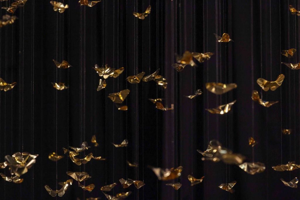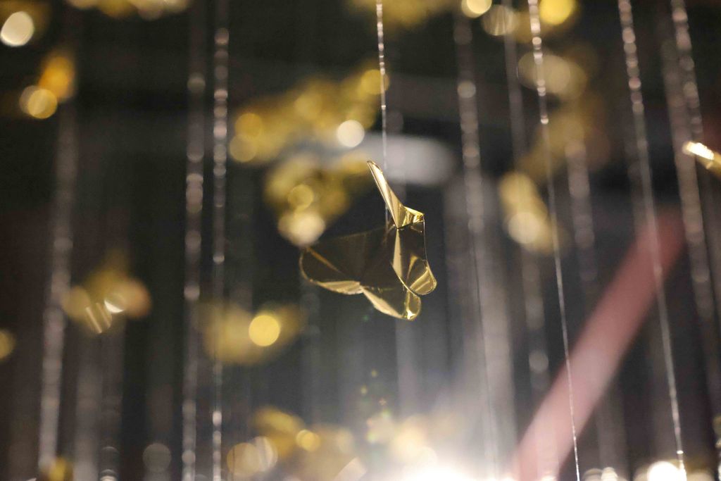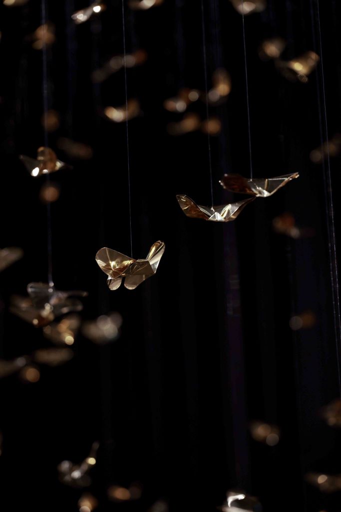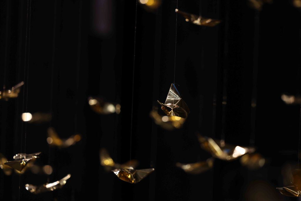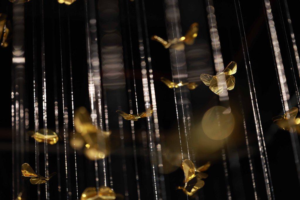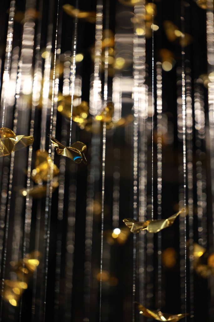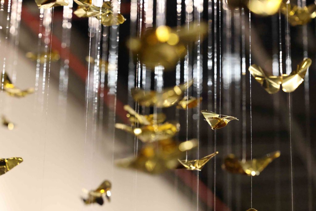 “Golden Metamorphosis” is a suspended installation sculpture that explores the process of healing and the reintegration of fragmented souls back into a state of “Oneness.” This artwork questions the concepts of fragmentation and rebirth as fundamental conditions of human existence, utilizing an artistic language that merges hand-folded brass sheets with the philosophy and profound wisdom of the Lanna culture.