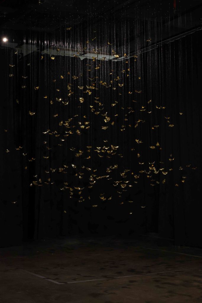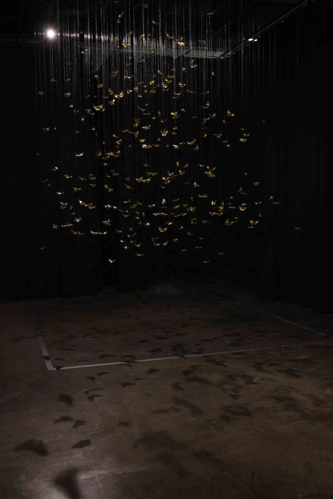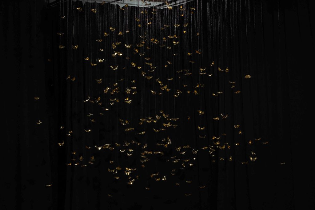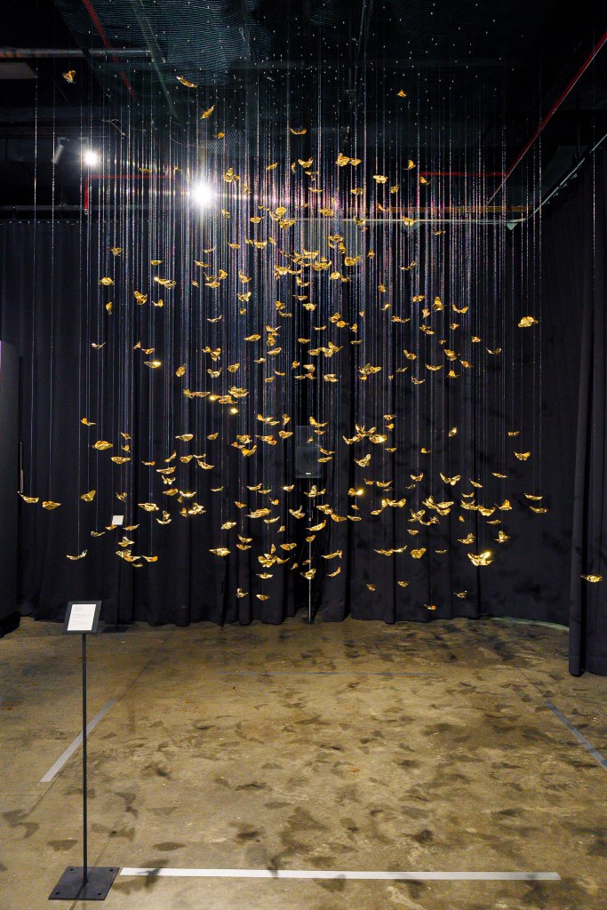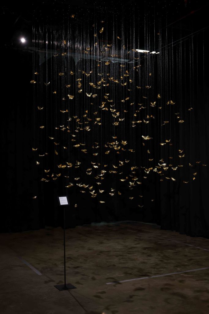 The core inspiration for this piece stems from the artist’s personal experience with Panic Disorder. This psychological state is likened to the scattering and shattering of “Khwan”—the vital life force or fragments of the soul in Lanna belief. The artist translates the concept of the “Body as Archive” through 320 hand-folded brass butterflies, metaphorically representing the 32 Khwan of a human being scattered across 10 directions (the eight cardinal and ordinal directions, the heavens above, and the earth below). Each butterfly serves as a vessel for the memories and emotions deeply embedded within muscles and the nervous system. This aligns with the theory of Embodied Cognition, which posits that memory resides not only in the brain but is inscribed throughout every cell of the body. Each butterfly thus represents a once-shattered fragment of experience that, when woven back together by barely visible threads, forms a new structure that is simultaneously fragile and resilient.