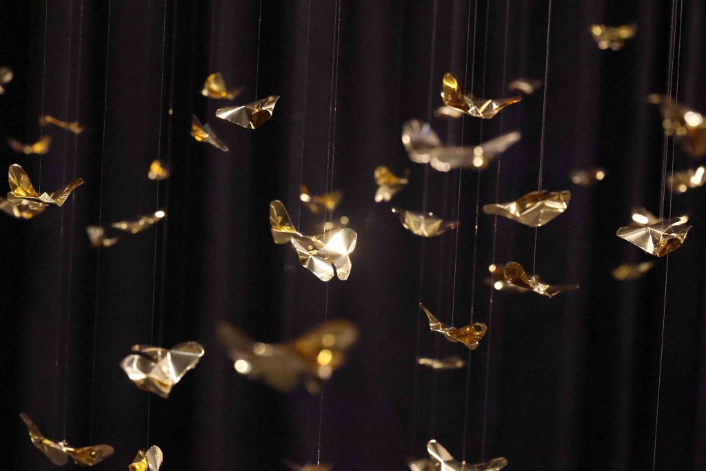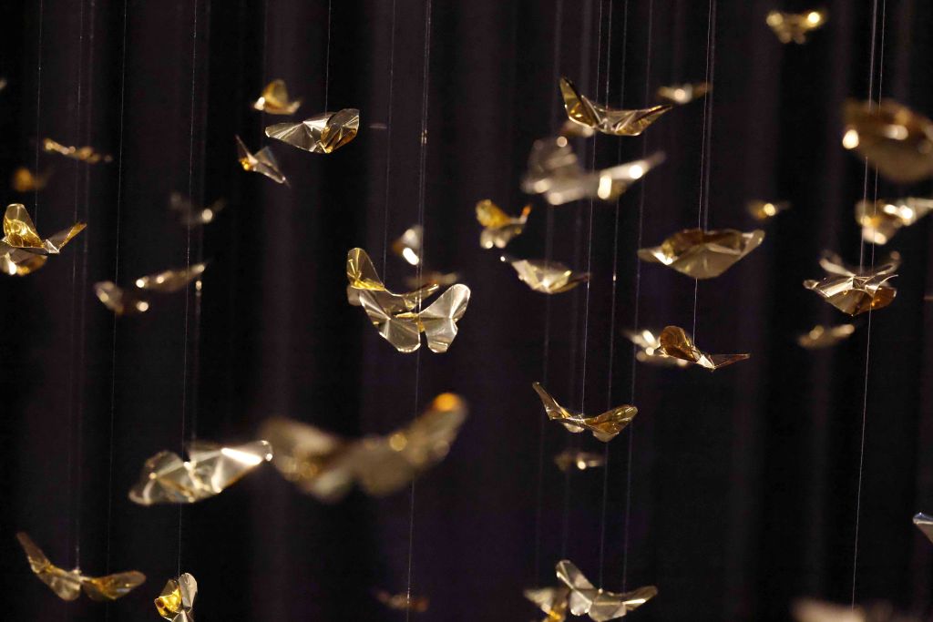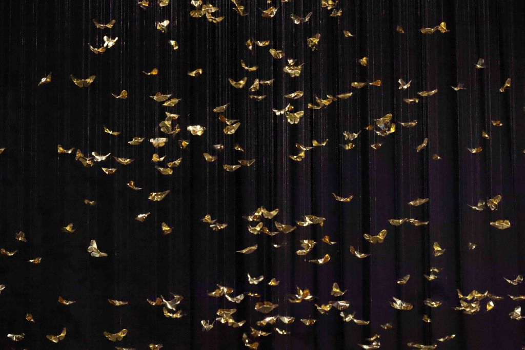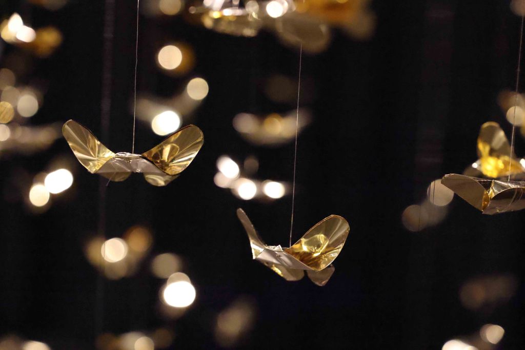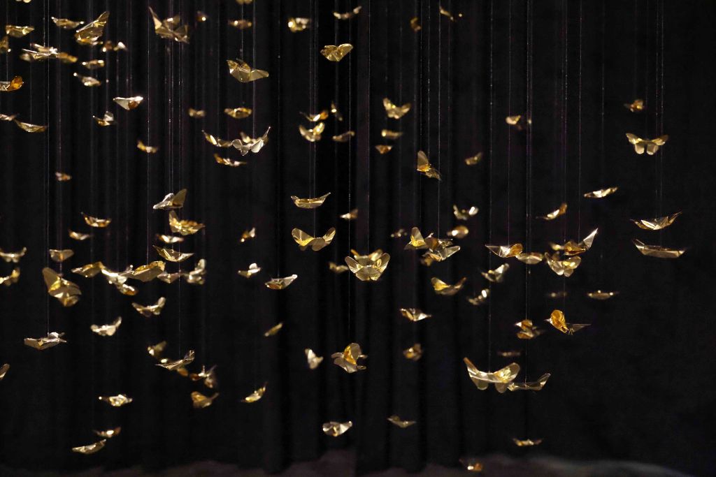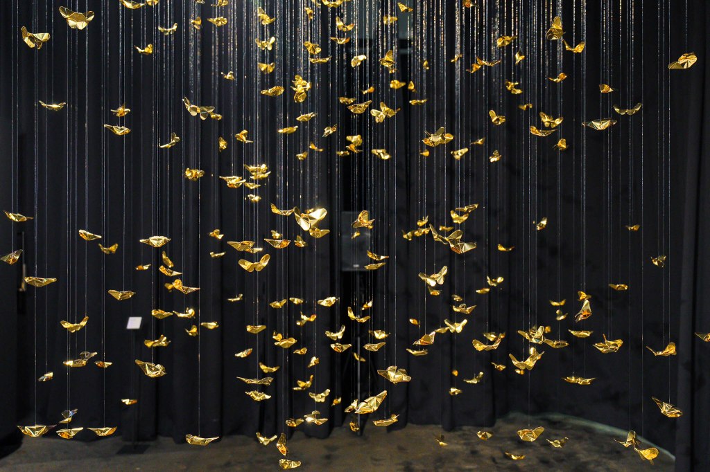 The core inspiration for this piece stems from the artist’s personal experience with Panic Disorder. This psychological state is likened to the scattering and shattering of “Khwan”—the vital life force or fragments of the soul in Lanna belief. The artist translates the concept of the “Body as Archive” through 320 hand-folded brass butterflies, metaphorically representing the 32 Khwan of a human being scattered across 10 directions (the eight cardinal and ordinal directions, the heavens above, and the earth below). Each butterfly serves as a vessel for the memories and emotions deeply embedded within muscles and the nervous system. This aligns with the theory of Embodied Cognition, which posits that memory resides not only in the brain but is inscribed throughout every cell of the body. Each butterfly thus represents a once-shattered fragment of experience that, when woven back together by barely visible threads, forms a new structure that is simultaneously fragile and resilient.