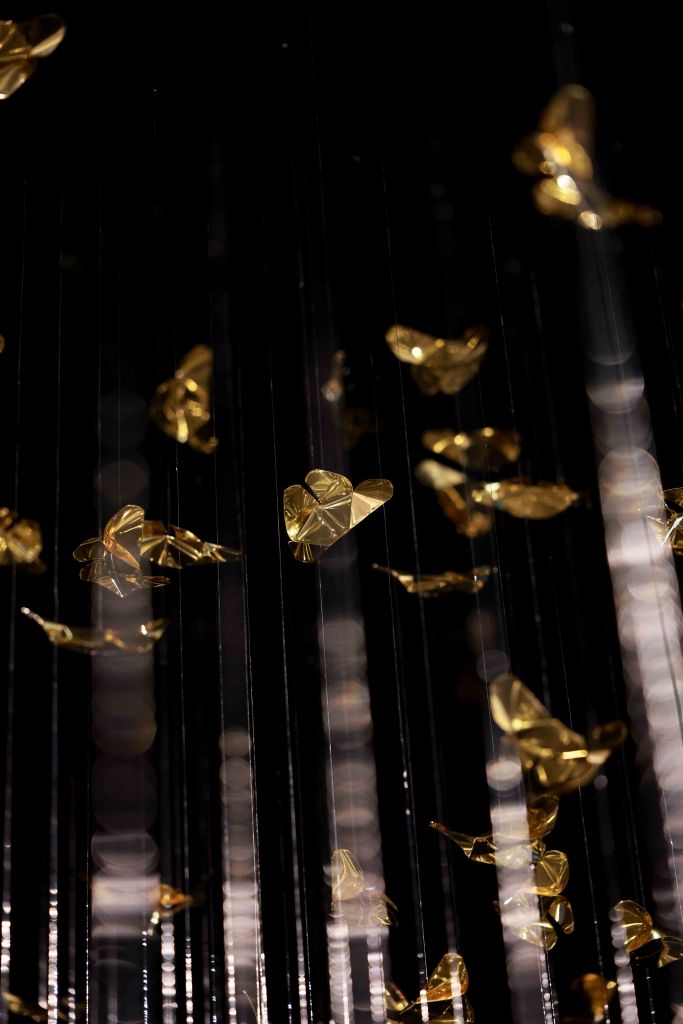 กลุ่มผีเสื้อทองเหลืองที่แขวนลอยอยู่นี้ จำลองห้วงขณะแห่งการเปลี่ยนผ่าน (Metamorphosis) จากความมืดมนสู่วิถีที่เปล่งประกาย แสงที่ตกกระทบสร้างมิติแห่งเงาและจังหวะการเคลื่อนไหวที่ราวกับมีชีวิต เสมือนพิธีกรรม “เรียกขวัญ” (Su Khwan) ที่นำพาพลังงานที่กระจัดกระจายกลับคืนสู่ศูนย์กลาง ซึ่งมิใช่เพียงการเรียกคืนดวงวิญญาณในทางตรง แต่คือการสานสายใยแห่งความสัมพันธ์ระหว่างตนเอง ชุมชน และบริบทแวดล้อมที่เคยขาดสะบั้นให้กลับมาเชื่อมต่อกันอีกครั้ง ปรากฏการณ์นี้สะท้อนล้อไปกับแนวคิดความพัวพันเชิงควอนตัม (Quantum Entanglement) ที่ชี้ว่าอนุภาคซึ่งเคยมีความสัมพันธ์กัน จะยังคงเชื่อมโยงถึงกันเสมอไม่ว่าจะอยู่ห่างไกลเพียงใด