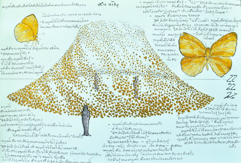 “ผีเสื้อ” ถูกเลือกใช้เป็นสัญลักษณ์ศูนย์กลางของผลงาน โดยในความเชื่อของกลุ่มชาติพันธุ์ไท-ไต ผีเสื้อคือร่องรอยของจิตวิญญาณหรือดวงวิญญาณบรรพบุรุษที่ยังคงเวียนว่าย ศิลปินหยิบยืมสัญลักษณ์นี้มาเป็นอุปลักษณ์ของการเปลี่ยนผ่านและการกำเนิดใหม่สองวาระ จากหนอนที่อิงแอบกับผืนดินและข้อจำกัดของโลกวัตถุ สู่การสลายตัวในรังไหม และอุบัติขึ้นใหม่เป็นผีเสื้อที่โบยบินสู่ท้องฟ้า ผีเสื้อจึงทำหน้าที่เสมือนสะพานเชื่อมระหว่างผืนดินและแผ่นฟ้า ดุจแสงระยิบระยับบนผิวน้ำที่สะท้อนทั้งความสูงส่งเบื้องบนและความลึกล้ำเบื้องล่างในขณะเดียวกัน